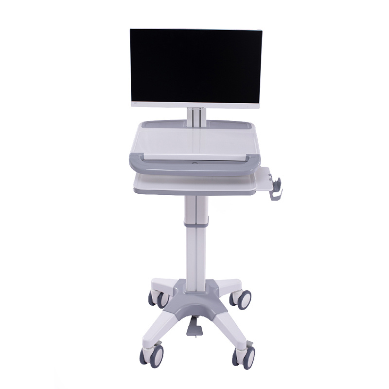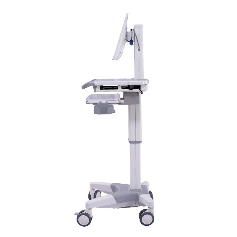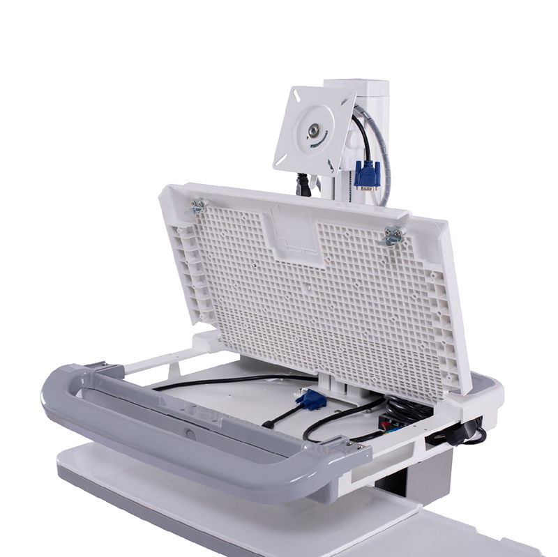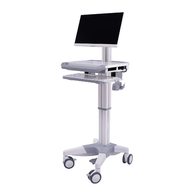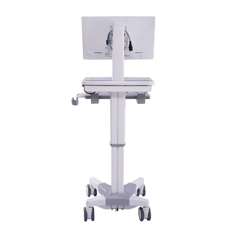 1). Height adjust fixed 2). Display rack hi-low with VESA, Loading capacity≦12Kg,proposed size of display ≤ 22 inch or all-in-one machine 3). Storage Bin with handle 4). Optional Built in power line 5). Keyboard tray, size: 440mm(L)×256mm(W) 6). Mouse tray, support both left hand and right hand using 7). Aluminium alloy column 8). Base: ABS plastic shell 9). Silent medical casters |