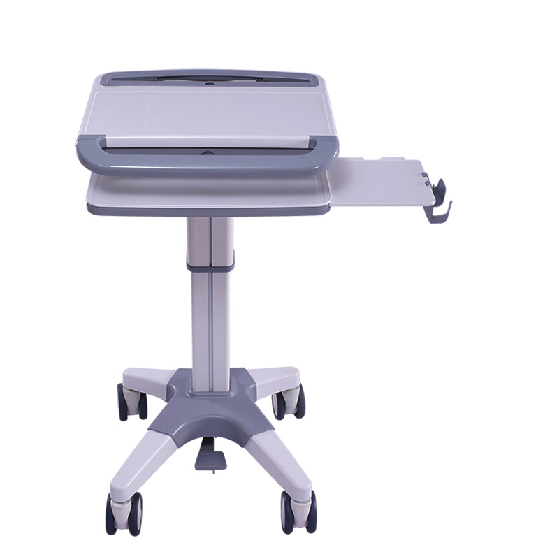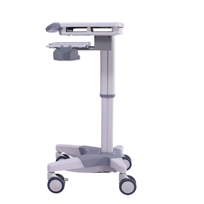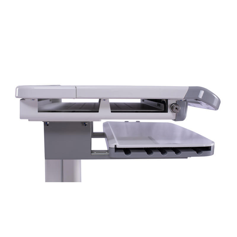 1). Laptop Cabinet with lock, support for laptop ≤17“ 2). ABS worksurface, size: 490mm(L)×460mm(W) Height: 720mm-970mm 3). Height adjust by foot, with gas spring structure 4). Keyboard tray, size: 465mm(L) x 234mm(W) 5). Mouse tray, support both left hand and right hand using 6). Silent medical casters (100mm), two with brake and two without brake |