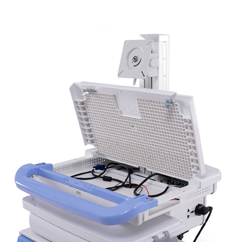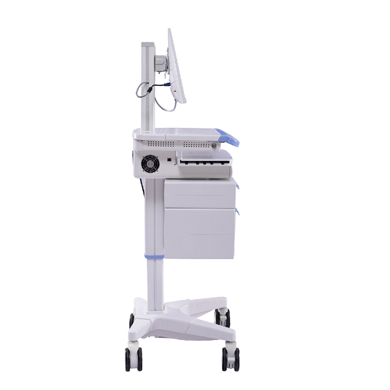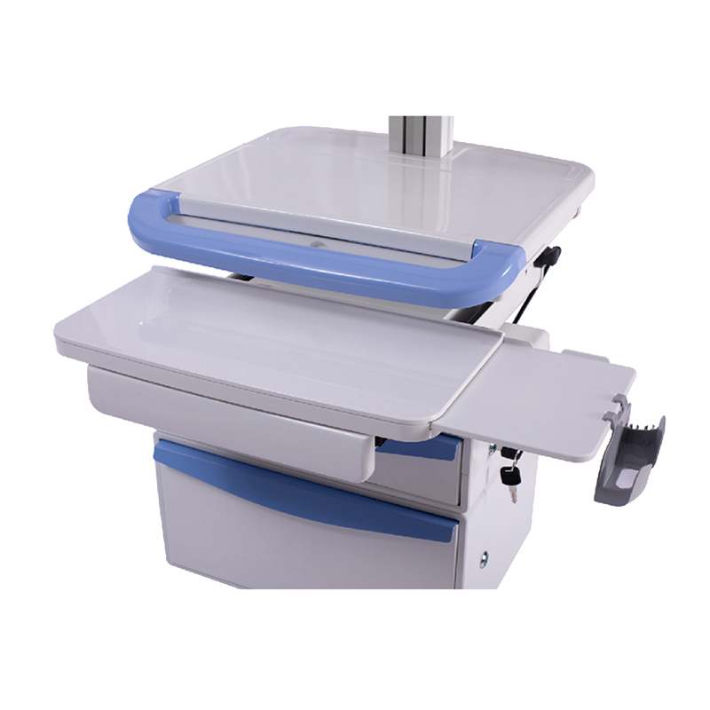 1). Height fixed 2). Display rack hi-low with VESA, Loading capacity≦12Kg,proposed size of display ≤ 22 inch or all-in-one machine 3). Durable ABS plastic worksurface,Height of Tabletop: 1000mm 4). The middle of the table can be opened for placing mini PC. 5). Keyboard tray, size: 465mm(L) x 234mm(W) 6). Mouse tray, support both left hand and right hand using 7). Four layers drawers with lock 8). Built-in battery and inverter, charger 9). Led keyboard light 10). Aluminium alloy column 11). Base: ABS plastic shell 12). Silent medical casters 13). Pedal sorting trash cans 6.5L *2 14). sharps box 3L *2 15). Hand elimination liquid hangers*1 16). Storage box *1 |